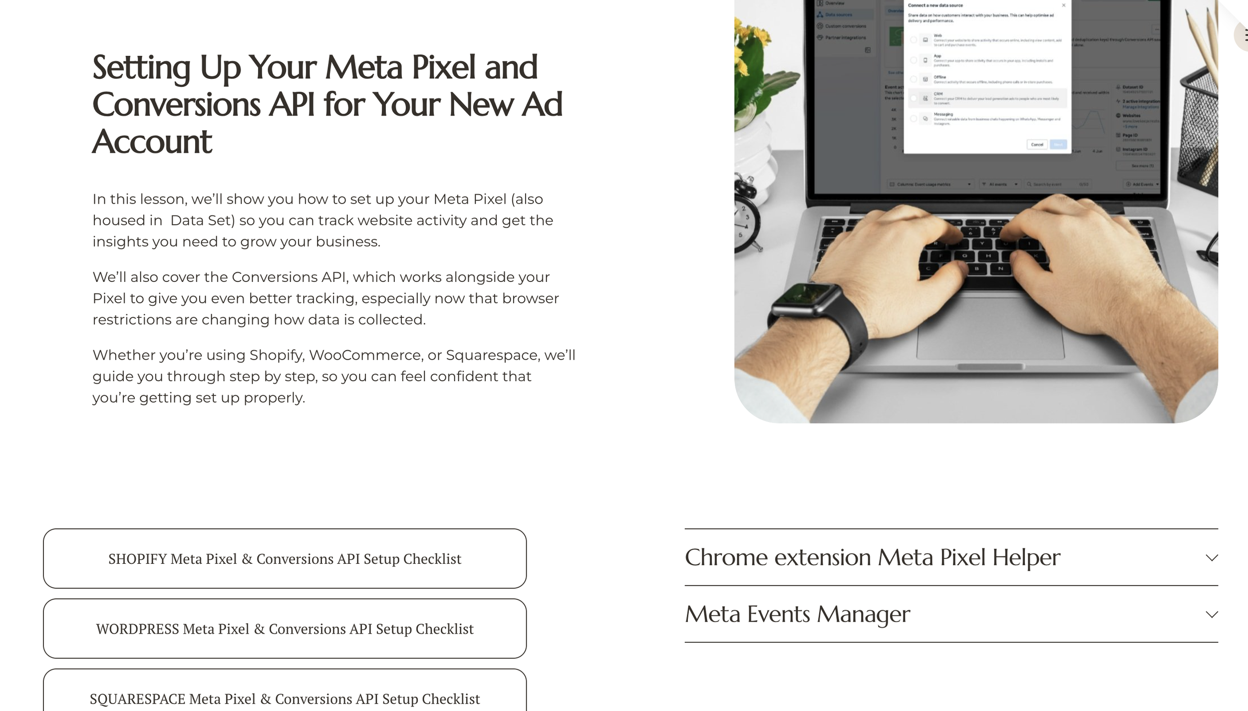 You’ll not only learn how to set up and run your ads, but you’ll also be prepared to work confidently with an agency or freelancer when the time comes. With your ad account set up properly, you’ll avoid paying extra for setup costs and be able to launch faster and more effectively.